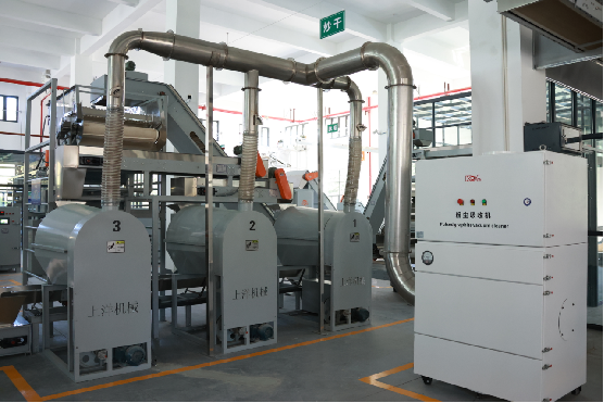 機(jī)組組成:本機(jī)組由瓶式炒干機(jī)、計(jì)量?jī)?chǔ)料斗、提升機(jī)、出料振動(dòng)槽、除塵裝置、機(jī)組集成控制系統(tǒng)組成。