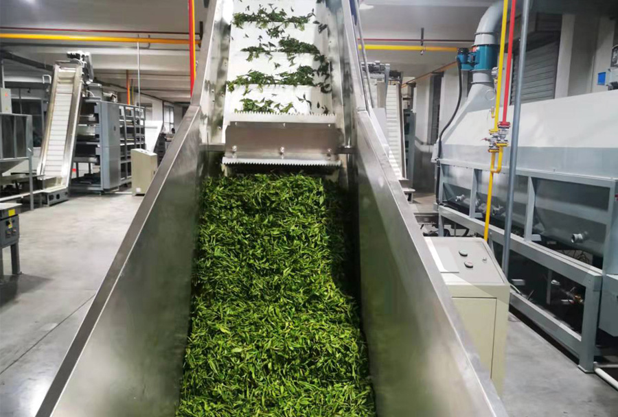 茶葉輸送機(jī)是茶葉加工生產(chǎn)線的重要組成部分,分皮帶式、振動(dòng)槽式等,可平面輸送、高低錯(cuò)位輸送,根據(jù)需要再配套勻葉、清理、調(diào)速、除塵等裝置,在整個(gè)生產(chǎn)線中起到連接主機(jī)、控制產(chǎn)能、平衡流量等功能,是生產(chǎn)線實(shí)現(xiàn)不落地、清潔化生產(chǎn)必不可少的配套設(shè)備。